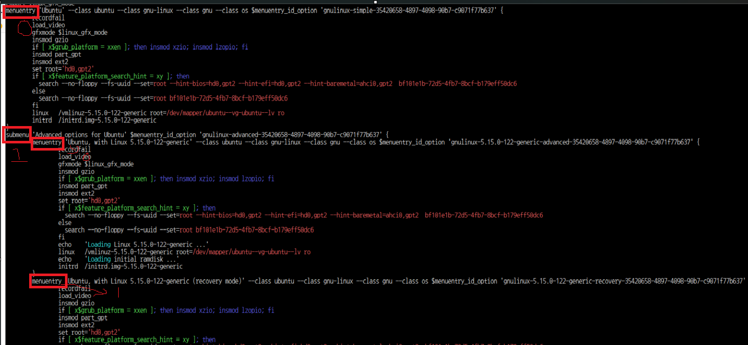 그 이후 submenu 안에 menuentry에 설치된다. 위 예시처럼 0번부터 다시 시작한다